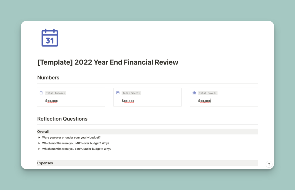 2022 Year End Financial Review Notion TemplateSGD$0+SGD$0+https://schema.org/InStocksgdThe WeeblingsThe WeeblingsA Notion template for your 2022 financial review.Name a fair price:SGD$I want this!Notion TemplateAdd to wishlist New wishlistShare on XShare on Facebook Copy linkCopy product URL